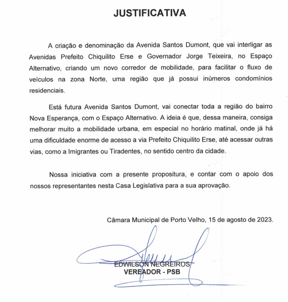 “A criação e denominação da Avenida Santos Dumont, que vai interligar as Avenidas Prefeito Chiquilito Erse e Governador Jorge Teixeira, no Espaço Alternativo, gera um novo corredor de mobilidadea a fim de facilitar o fluxo de veículos na zona Norte, uma região que já possui inúmeros condomínios residenciais. A Avenida Santos Dumont vai conectar toda a região do bairro Nova Esperança com o Espaço Alternativo. A ideia é que, dessa maneira seja possível melhorar muito a mobilidade urbana, em especial no horário matinal, onde já há uma dificuldade enorme de acesso a via Prefeito Chiquilito Erse, até acessar outras vias, como a Imigrantes ou Tiradentes, no sentido centro da cidade", encerrou o o membro da Casa de Leis-mirim.