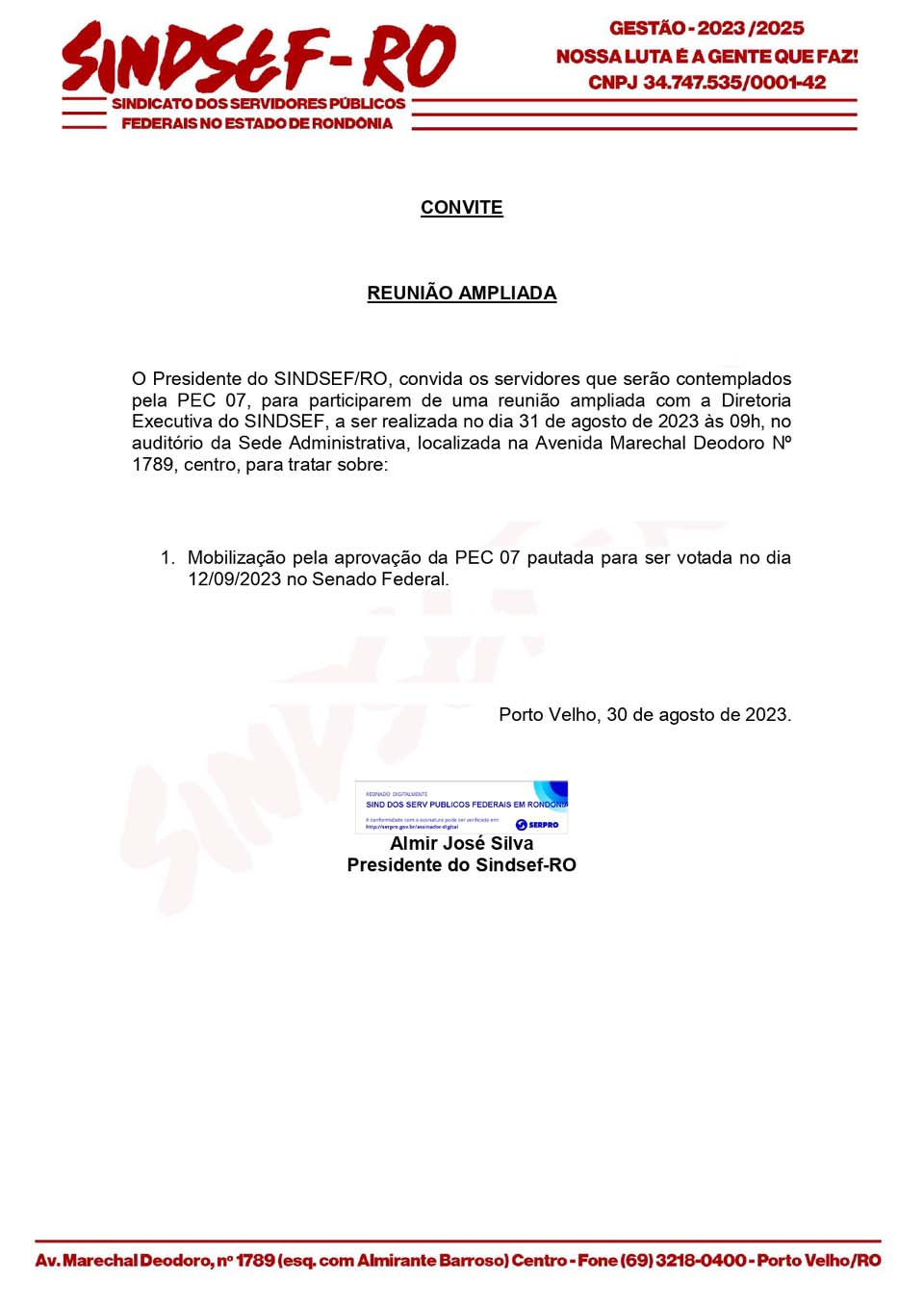 Convite do SINDSEF-RO para reunião ampliada na próxima quinta-feira (31), com tema mobilização da PEC 07