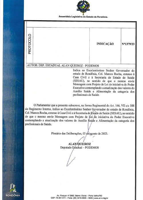 Com a finalidade de reconhecer e valorizar o trabalho essencial desempenhado pelos profissionais da saúde, o deputado estadual Alan Queiroz indicou ao Governo de Rondônia, por meio da Secretaria de Estado da Saúde, a emissão de uma mensagem com Projeto de Lei para a elaboração do reajuste do auxílio alimentação e auxílio saúde desses profissionais.