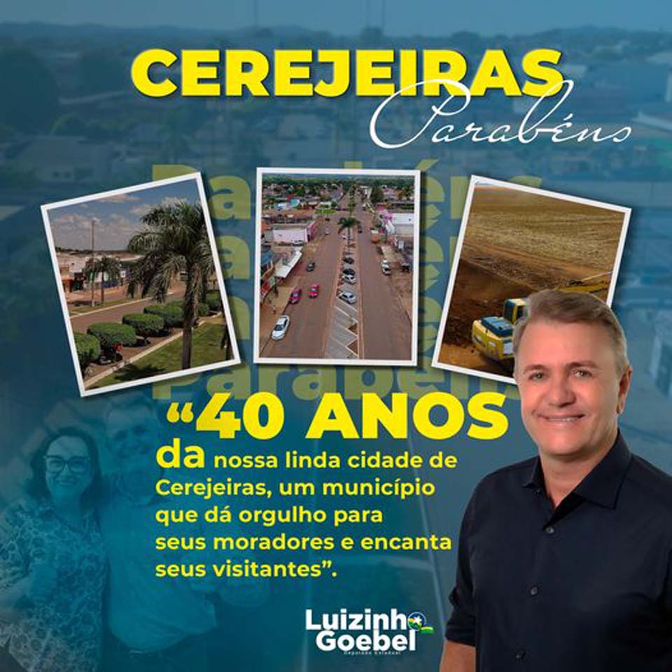 Cerejeiras;RO - O Deputado Estadual Luizinho Goebel, no último sábado (5), usou sua rede social para parabenizar a cidade de Cerejeiras, que completa 40 anos de existência. O parlamentar na oportunidade também parabenizou e enalteceu a população ordeira e acolhedora do município.