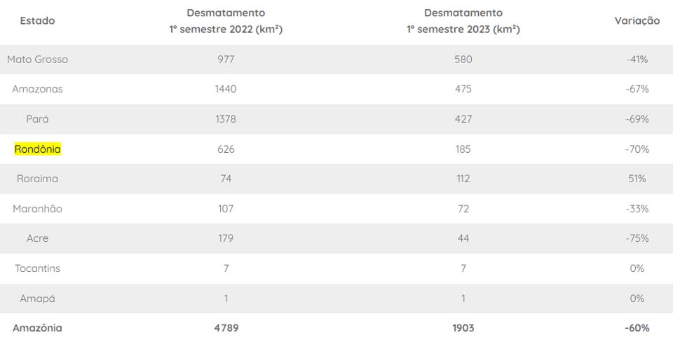 Porto Velho, RO – O Instituto do Homem e Meio Ambiente da Amazônia (Imazon) divulgou dados que apontam uma diminuição significativa no desmatamento da Amazônia no primeiro semestre de 2023. Segundo o Sistema de Alerta de Desmatamento (SAD) do Imazon, a área desmatada no período foi de 1.903 km², representando uma redução de 60% em relação ao mesmo período do ano anterior. Em Rondônia, a diminuição é de 70%.