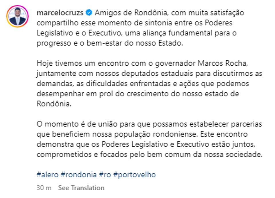 “Amigos de Rondônia, com muita satisfação compartilho esse momento de sintonia entre os Poderes Legislativo e o Executivo, uma aliança fundamental para o progresso e o bem-estar do nosso Estado”, asseverou.