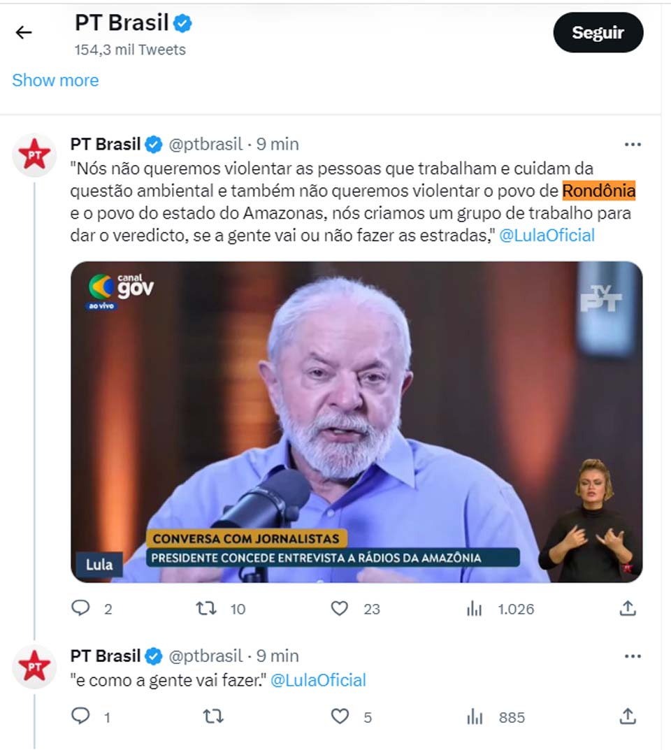 Porto Velho, RO – Na manhã desta quinta-feira, 03, o presidente Lula, do PT, conversou com jornalistas da Amazônia em live realizada no canal oficial de sua legenda via YouTube. Entre os assuntos abordados, estão pautas relacionadas à construção de estradas na região.