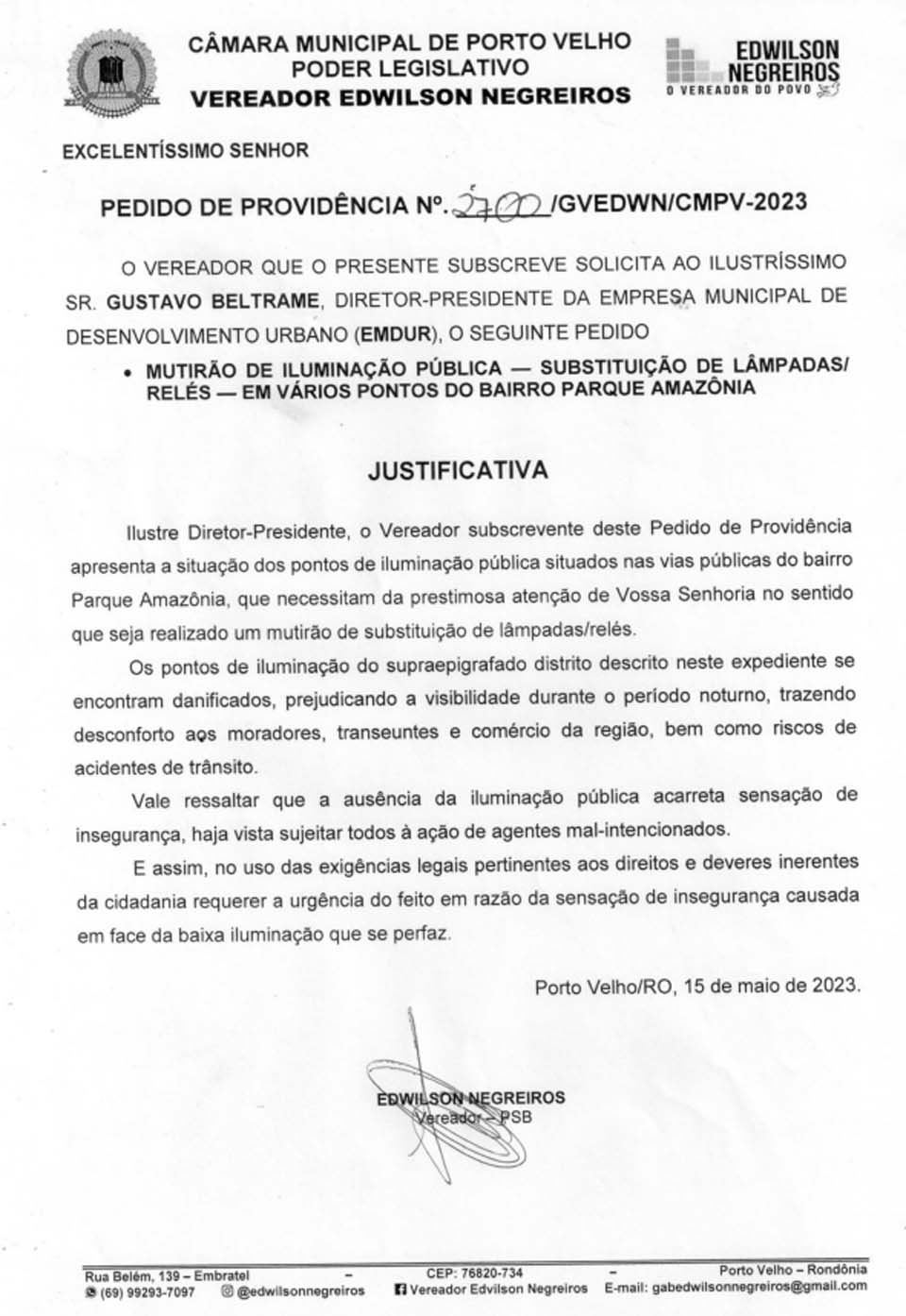 Porto Velho, RO – O Gabinete do vereador Edwilson Negreiros, membro do PSB e representante da cidade de Porto Velho, tomou medidas para abordar uma questão vital para o Bairro Parque Amazônia. Um pedido de providência formal foi encaminhado à Empresa Municipal de Desenvolvimento Urbano (EMDUR), buscando a substituição de lâmpadas e relés defeituosos que impactavam vários pontos da localidade.