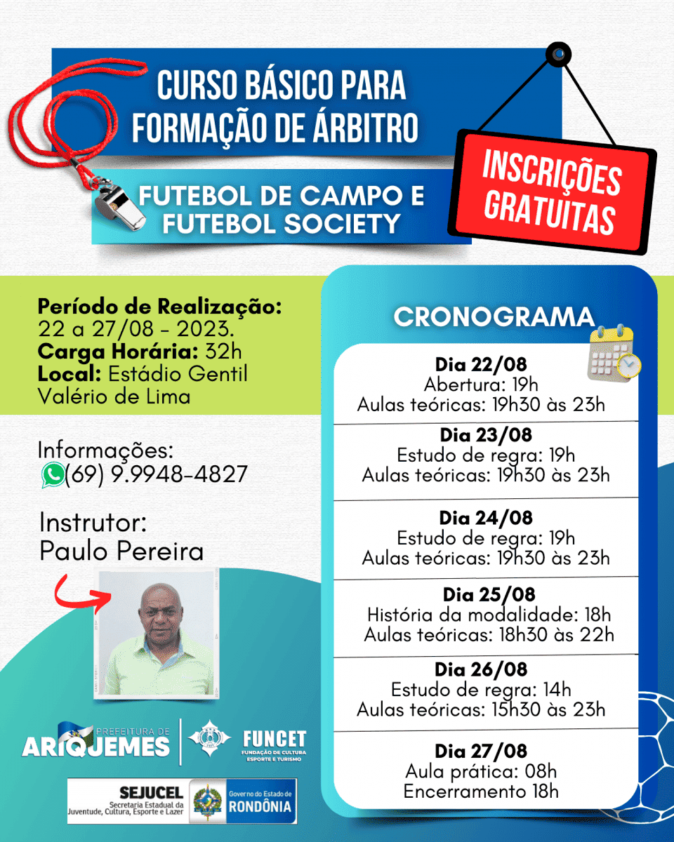 A Prefeitura de Ariquemes, através da Fundação de Cultura, Esporte e Turismo - FUNCET em parceria com a Secretaria de Estado da Juventude, Cultura, Esporte e Lazer – SEJUCEL, abriu inscrições para um curso de arbitragem.