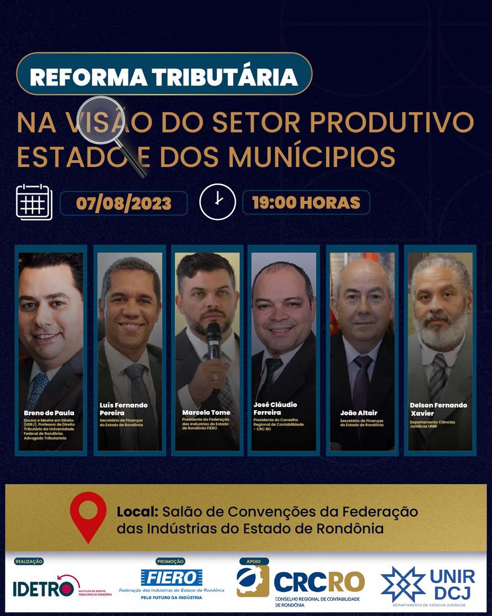 Porto Velho,RO - O Instituto de Direito Tributário de Rondônia-IDETRO em parceria com a Federação das Indústrias de Rondônia-FIERO, realiza na próxima segunda-feira (7), evento para debater a Reforma Tributária na visão do Sertor Produtivo do Estado e Municípíos.
