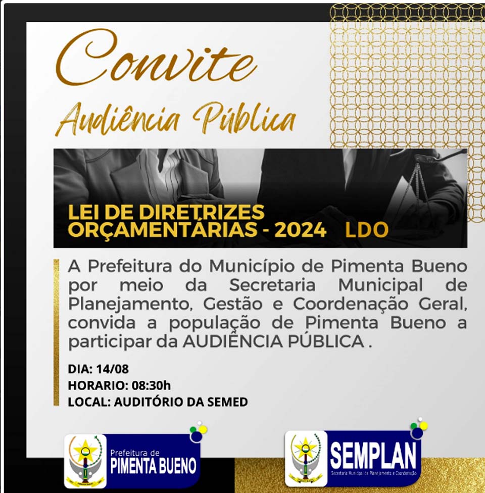 A Prefeitura do Município de Pimenta Bueno por meio da Secretaria Municipal de Planejamento, Gestão e Coordenação Geral, convida a população de Pimenta Bueno a participar da Audiência Pública que ocorrerá no dia 14 de agosto, segunda feira, no auditório da SEMED.