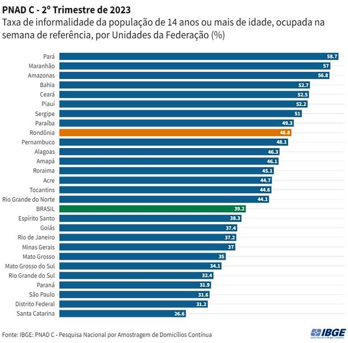 No geral, Santa Catarina (26,6%), Distrito Federal (31,2%), São Paulo (31,6%), Paraná (31,9%) e Rio Grande do Sul (32,4%) apresentam as menores taxas de informalidade. Já as maiores estão no Pará (58,7%), Maranhão (57%), Amazonas (56,8%), Bahia (52,7%), Ceará (52,5%) e Piauí (52,2%).