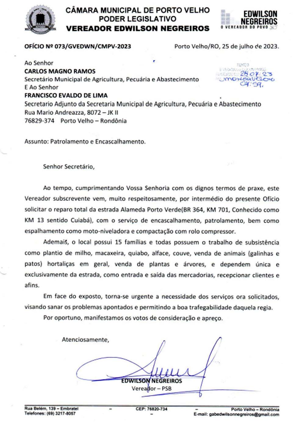 Porto Velho, RO – O Gabinete do vereador Edwilson Negreiros, do PSB, enviou um pedido de providência à Secretaria de Agricultura, Pecuária e Abastecimento (SEMAGRIC) solicitando serviços de patrolamento e encascalhamento na estrada Alameda Porto Verde, localizada na BR-364, mais especificamente no KM 701, conhecido como KM 13 no sentido Cuiabá.