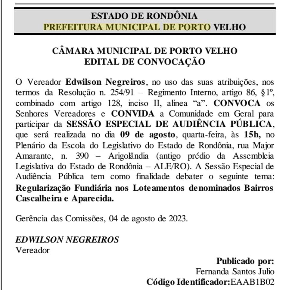 Porto Velho, RO – O vereador Edwilson Negreiros, do PSB, está convocando demais membros da Casa de Leis e convidando a Comunidade em Geral para participar de uma Sessão Especial de Audiência Pública.