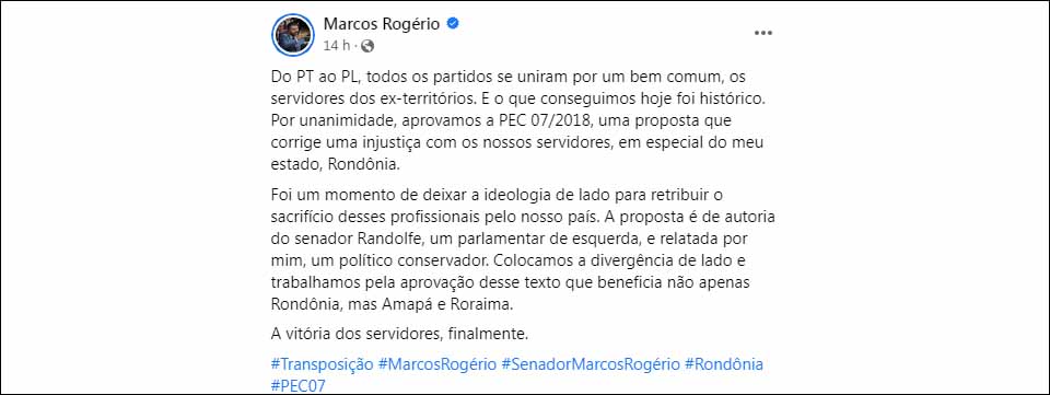 Antecipando-se a essas críticas, Marcos Rogério enfatizou a importância da conquista anunciada na postagem, que beneficiaria os servidores públicos. Ele optou por direcionar a atenção para o bem comum e a necessidade de superar divergências em nome do interesse público.