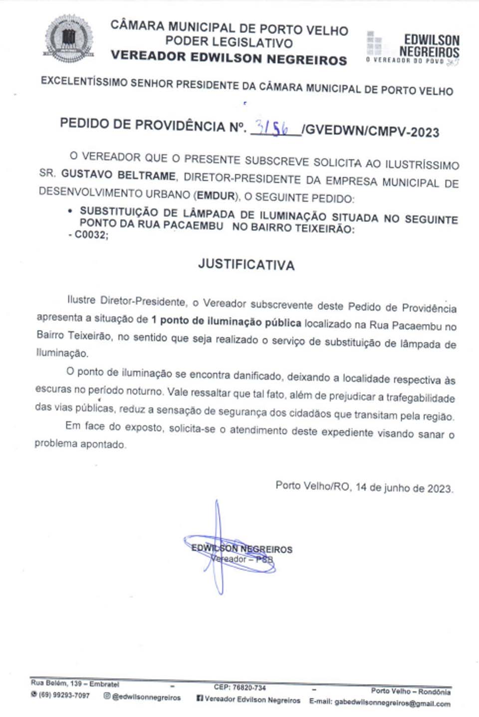 Porto Velho, RO – O vereador Negreiros, em prol do Bairro Teixeirão, na cidade de Porto Velho, encaminhou um importante pedido de providência à Empresa Municipal de Desenvolvimento Urbano (EMDUR). O requerimento visava a substituição de uma lâmpada de iluminação pública em um ponto crucial da Rua Pacaembu, que tem causado preocupações aos moradores da região.