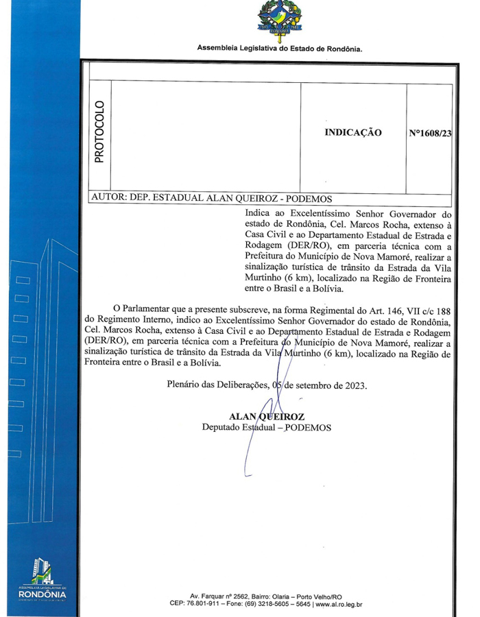 Com o objetivo de promover o turismo na Vila Murtinho, o deputado estadual Alan Queiroz (Podemos), indicou ao Governo de Rondônia, por meio do Departamento Estadual de Estrada e Rodagem (DER), em parceria técnica com a Prefeitura Municipal de Nova Mamoré, a implementação da sinalização turística na vila do município.