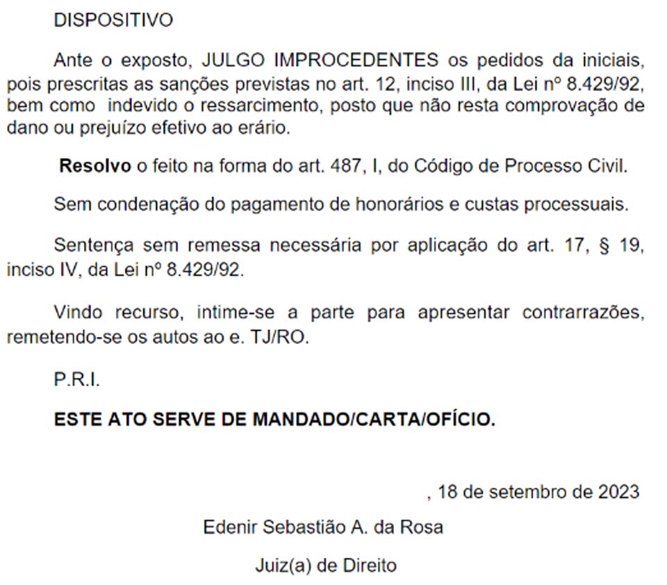“Todas esses apontamentos que ora levanto, assim o faço para demonstrar que, ainda que se teorizasse a aplicação retroativa da nova Lei de Improbidade, que elevou o prazo de prescrição para 08 anos contados da data dos fatos, ainda assim, restaria caracterizada a prescrição, isso considerando que os fatos atribuídos ao requeridos se limitam ao mês de junho do ano de 2005. Logo, considerando que a petição inicial intentada pelo Ministério Público Estadual fora protocolizada eletronicamente na data de 31.12.2015, tenho por operada a prescrição, já que passados mais de 10(dez) anos da data dos fatos”, anotou o juiz de Direito Edenir Sebastião Albuquerque da Rosa, da 2ª Vara da Fazenda Pública de Porto Velho, ao julgar a demanda improcedente.