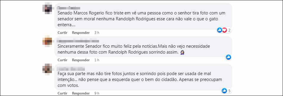 "Senador Marcos Rogério fico triste em vê uma pessoa como o senhor tirar foto com um senador sem moral nenhuma Randolph Rodrigues; esse cara não vale o que o gato enterra...".