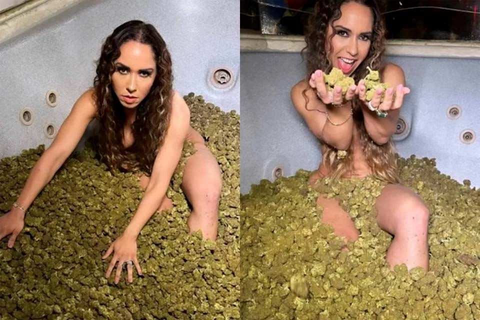 Renata Frisson, conhecida como Mulher Melão, chocou ao realizar um ensaio fotográfico no Uruguai onde aparece nua, coberta com 50 quilos de maconha em uma banheira. Segundo o Extra, a cantora esteve recentemente naquele país, onde a erva é legalizada, e se encantou com a produção de derivados da planta e sua utilização medicinal.