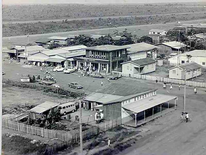 Foto Vilhena 1975, o Hotel do Gustão com dois andares em primeiro plano, a seguir a BR-364 ainda sem asfalto e ao fundo a pista de pouso da cidade. (F. Acervo João Paulo das Virgens/Saudosismo Portovelhense)