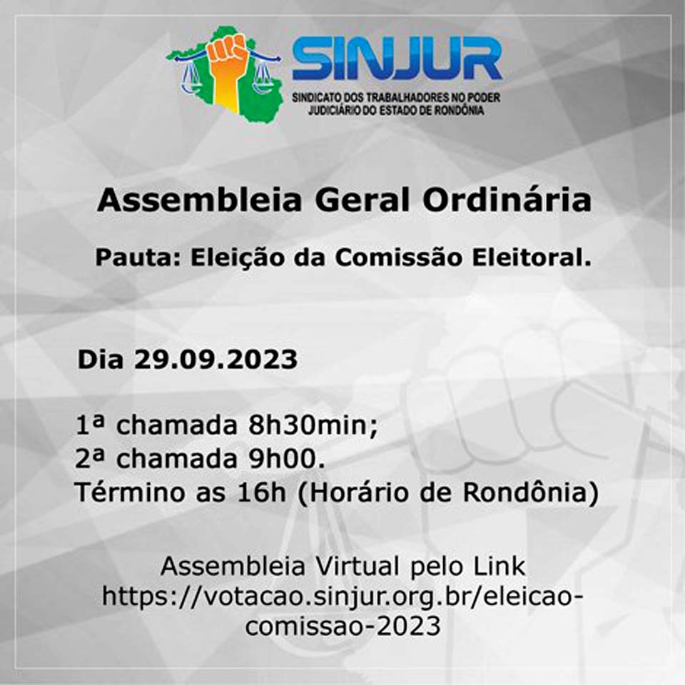 Porto Velho;RO - O Sindicato dos Servidores no Poder Judiciário fo Estado-SINJUR convoca Assembleia Geral Ordinária- Eleição Comissão Eleitoral