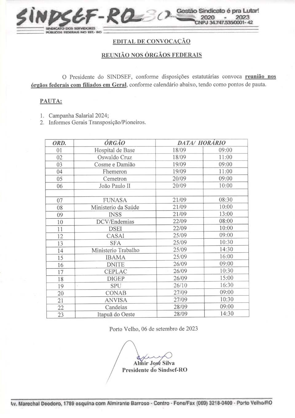 O Sindicato dos Servidores Públicos Federais no Estado de Rondônia – Sindsef/RO dará início a partir de 18 de setembro, às rodadas de reuniões nos órgãos federais em Porto Velho para mobilizar a categoria a intensificar a luta por reajuste salarial em 2024. Em todo país, a categoria tem se manifestado contra a proposta do governo federal de conceder apenas R$1,5 bilhão para todas as demandas, incluindo aumento salarial, benefícios e reestruturação de carreiras.