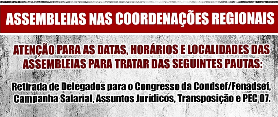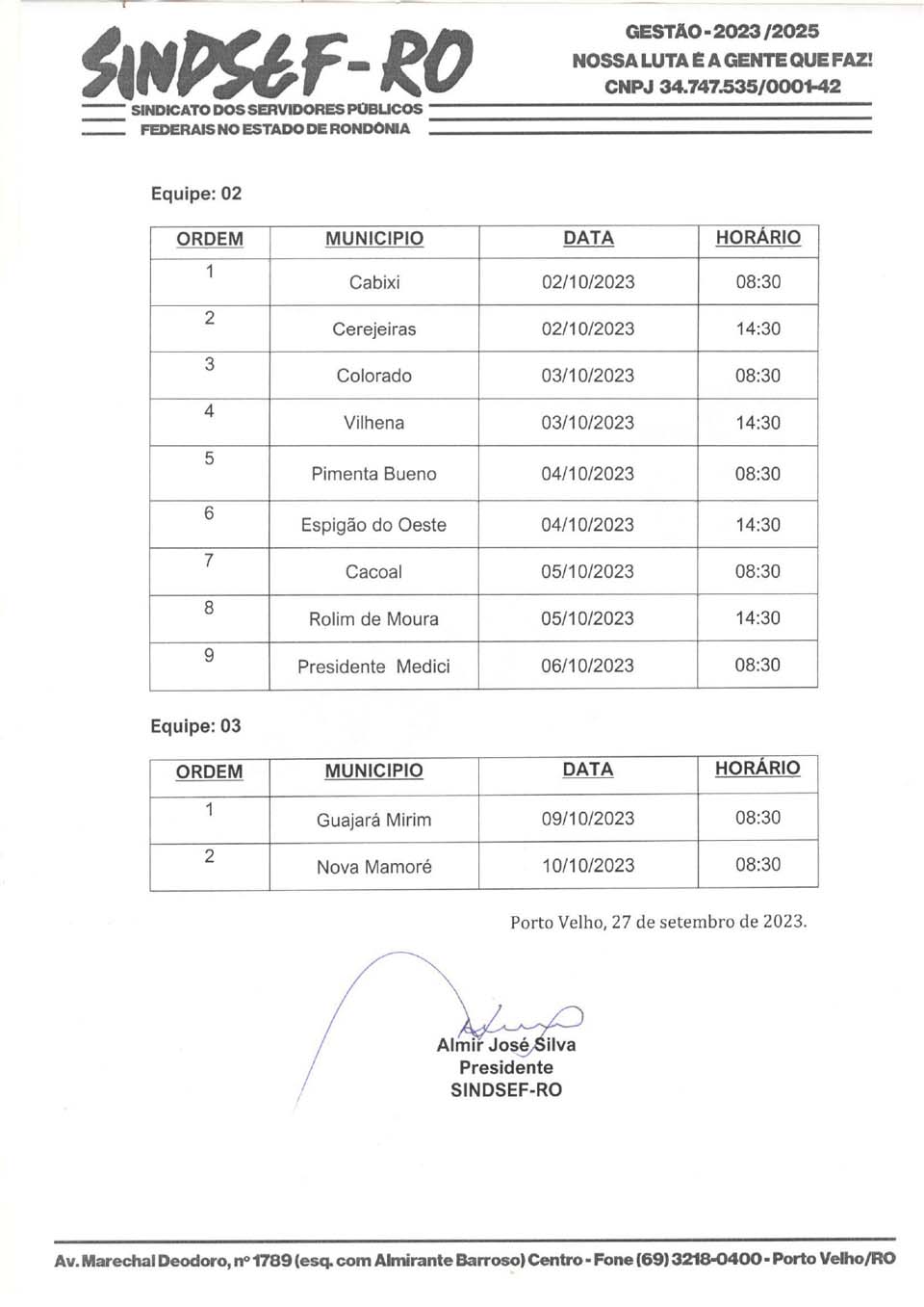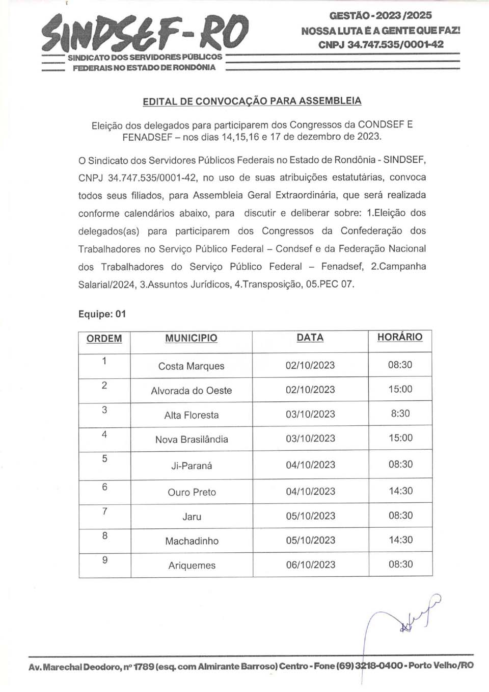 Porto Velho;RO - Na próxima semana, a partir de segunda-feira, dia 02 de outubro, duas equipes de diretores do Sindicato dos Servidores Públicos Federais no Estado de Rondônia - Sindsef/RO estarão percorrendo as Coordenações Regionais para realizar Assembleia Geral Extraordinária para discutir e deliberar sobre campanha salarial 2024, assuntos jurídico, transposição. pec 07 e eleição dos delegados para participarem dos Congressos da Condsef e Fenadsef.
