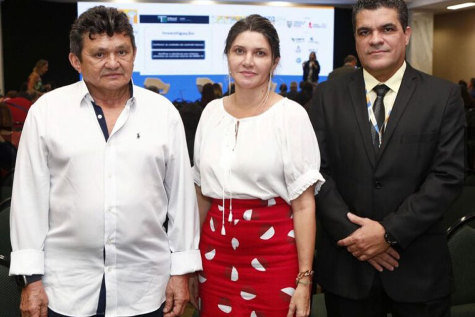 O conselheiro Francisco Carvalho, ouvidor do TCE-RO, e os servidores Ana Lúcia e Rubens Miranda, durante o ENCCO 2023