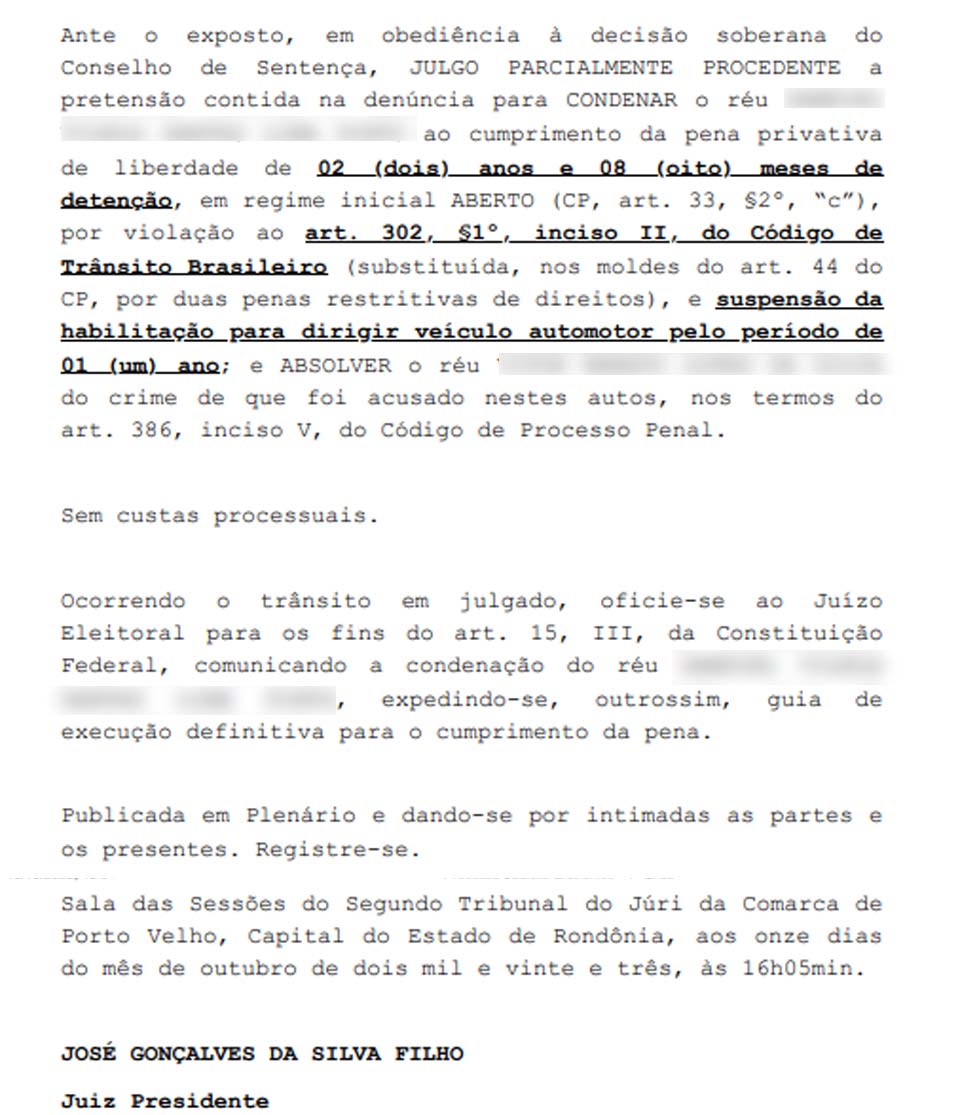 Não foram encontradas causas excludentes de ilicitude ou culpabilidade. Como resultado, o juiz aplicou uma pena de 02 (dois) anos de detenção.