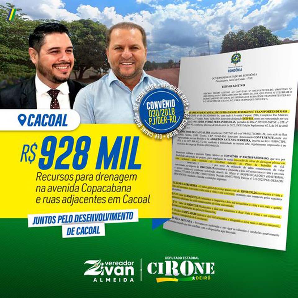 Cacoal;RO - O Deputado Estadual Cirone Deiró, anunciou nesta sexta-feira (20), a destinação de recursos na ordem 928 mil reais, para a execução de obras de drenagem na avenida Copacabana e ruas adjacentes em Cacoal.