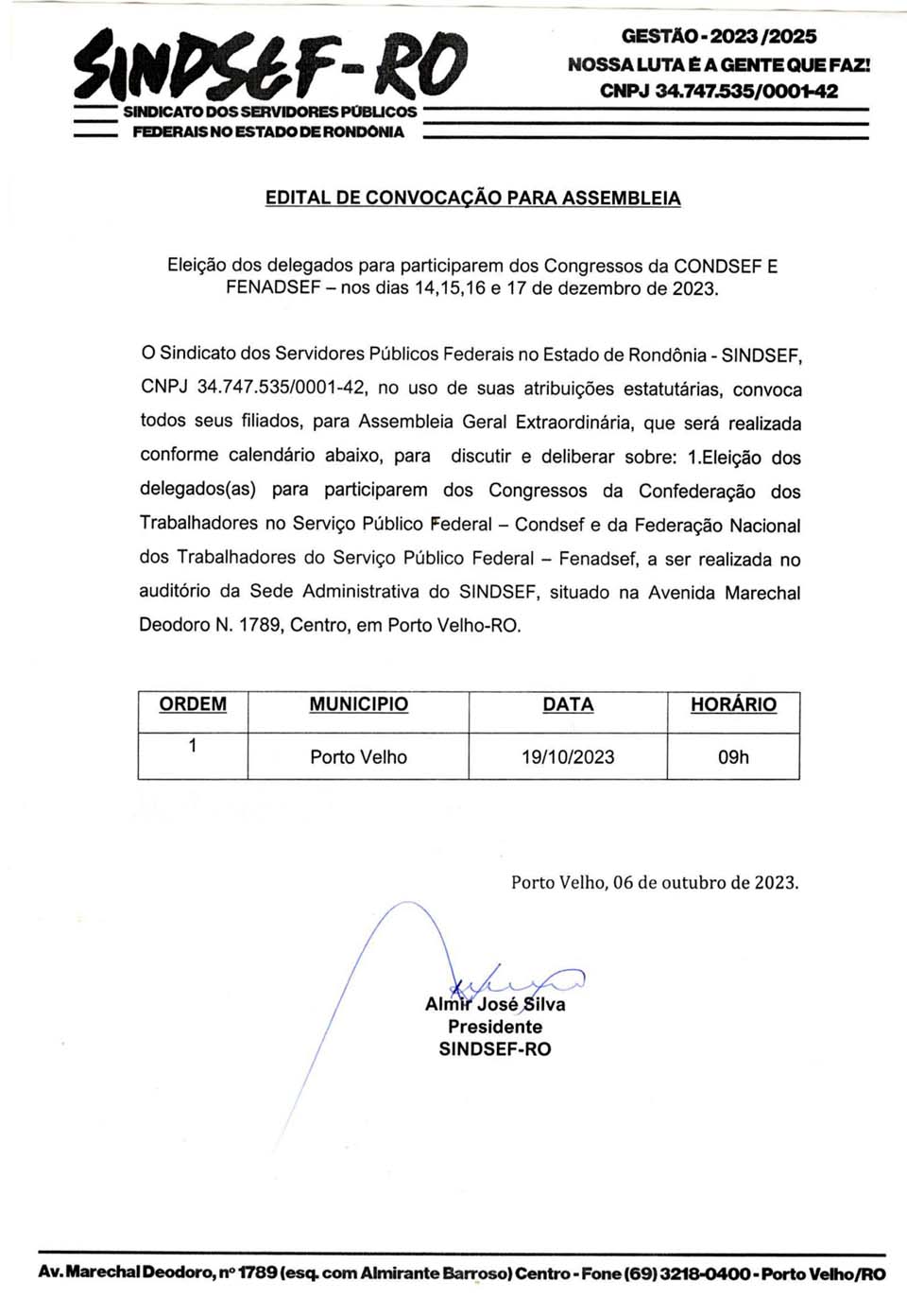 Porto Velho;RO - O Sindicato dos Servidores Públicos no Estado de Rondônia - SINDSEF-RO, no uso de suas atribuições estatutárias, convoca todos os seus filiados, para assembleia extraordinária, que será realizada conforme calendário abaixo: