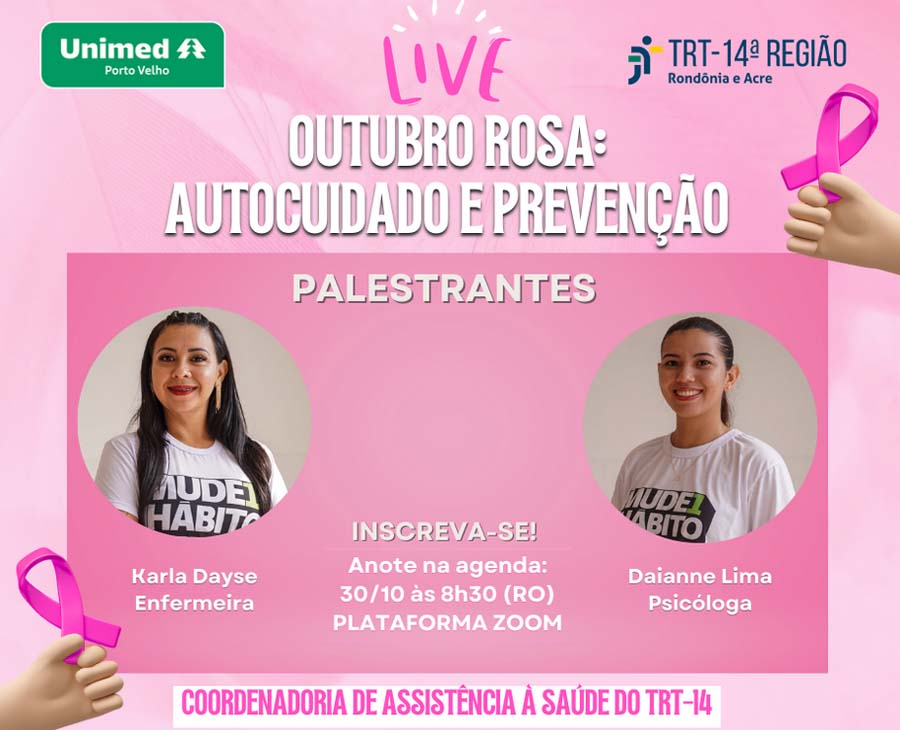 A convite do Tribunal Regional do Trabalho da 14ª Região (RO/AC), por meio da Coordenadoria de Assistência à Saúde, a Unimed realizou, nesta manhã de segunda-feira (30), uma live especial em alusão ao Outubro Rosa, mês dedicado à conscientização sobre o câncer de mama, para as servidoras do regional. O evento contou com a participação da enfermeira Karla Dayse e da psicóloga Daianne Lima como palestrantes, que enfatizaram a importância do autocuidado e da prevenção como formas de prevenir doenças.