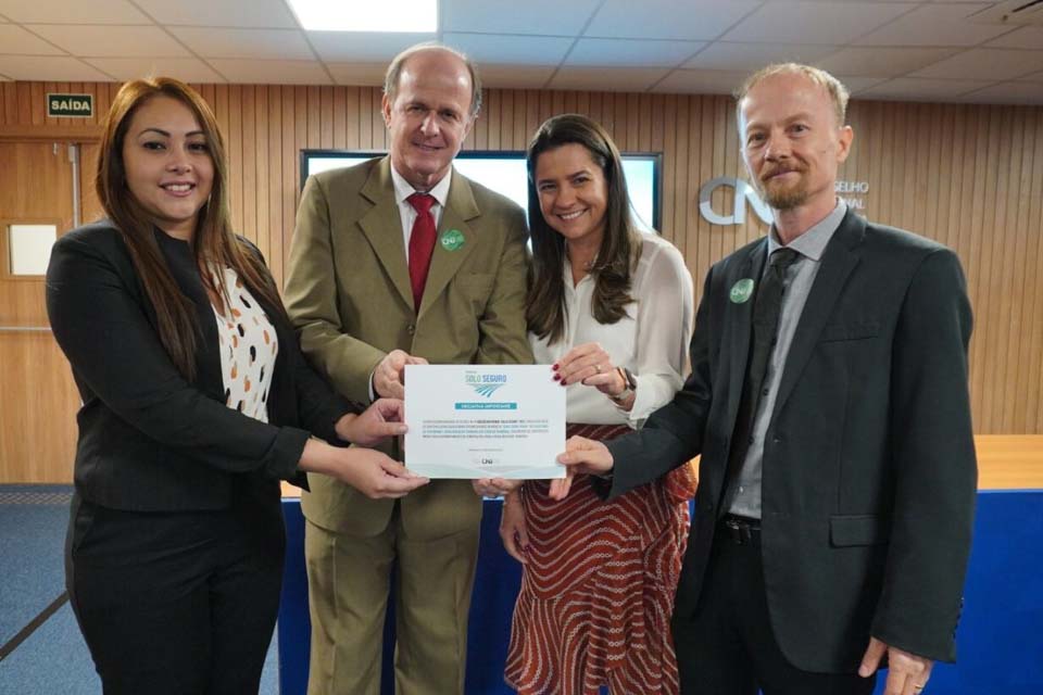 O Governo de Rondônia foi agraciado na quarta-feira (18), em Brasília (DF), com o Certificado de Iniciativa Importante no “Prêmio Solo Seguro”. A premiação, instituída pela Corregedoria Nacional de Justiça – CNJ, tem como objetivo reconhecer práticas inovadoras e bem-sucedidas no combate às ocupações clandestinas e na titulação de proprietários de áreas urbanas e rurais. O prêmio foi recebido pela coordenadora de Patrimônio Imobiliário da Secretaria de Estado de Patrimônio e Regularização Fundiária – Sepat, Laura Betânia dos Santos Cavalcante.