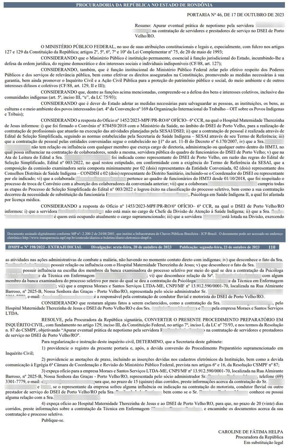 Porto Velho, RO – O Ministério Público Federal de Rondônia emitiu a Portaria nº 46, datada de 17 de outubro de 2023, para investigar a possível prática de nepotismo envolvendo uma servidora em relação à contratação de servidores e prestadores de serviços no Distrito Sanitário Especial Indígena (DSEI) de Porto Velho, no estado de Rondônia.
