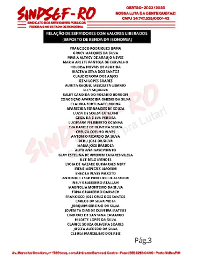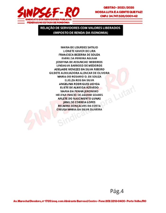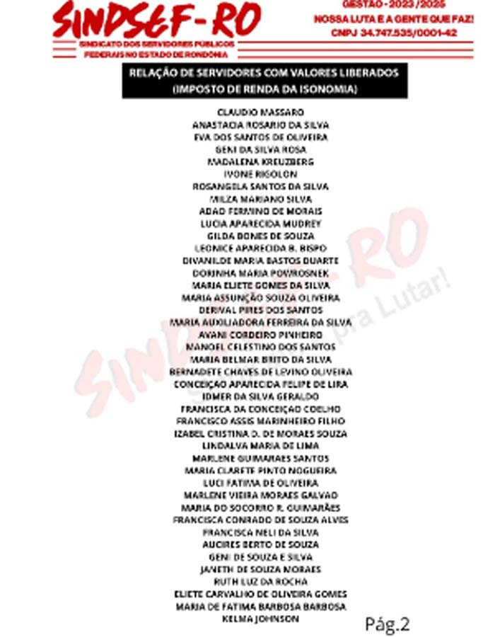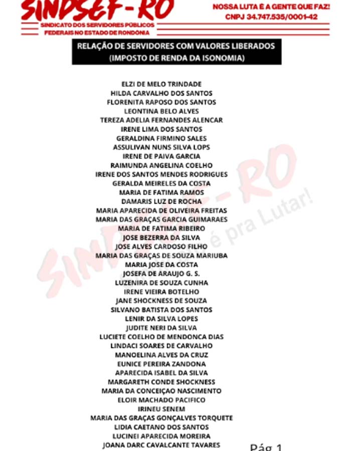 O Sindicato dos Servidores Públicos Federais no Estado de Rondônia - SindseF/RO comemora esta acompanhando a liberação dos pagamentos dos valores das ações individuais do imposto de renda da isonomia dos professores federais. Nesta quarta-feira (25/10), a Caixa informou a lista de mais professores que tiveram que tiverama o pagamento liberado pela Vara de Porto Velho.