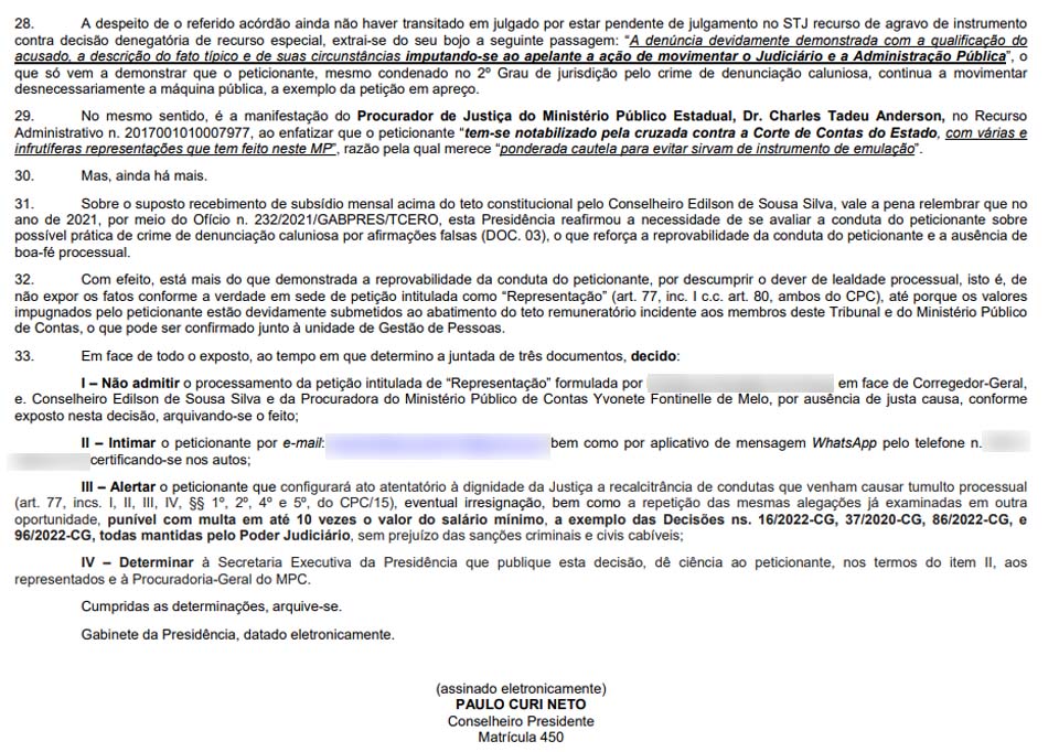 Em resumo, a decisão do TCE-RO arquivou a representação, ressaltando a reprovabilidade da conduta do autor da petição, que já havia sido condenado em segunda instância por denunciação caluniosa.