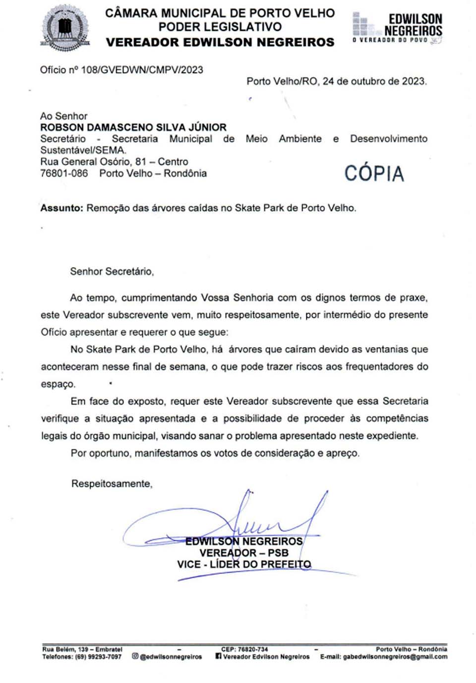 Edwilson Negreiros formalizou sua solicitação em nome do secretário Robson Damasceno Silva Júnior, que ocupa a posição de titular da pasta de Meio Ambiente e Desenvolvimento Sustentável (SEMA). A ação visa a agilizar o processo de remoção das árvores caídas no Skate Park de Porto Velho, garantindo a proteção dos cidadãos que frequentam o local.