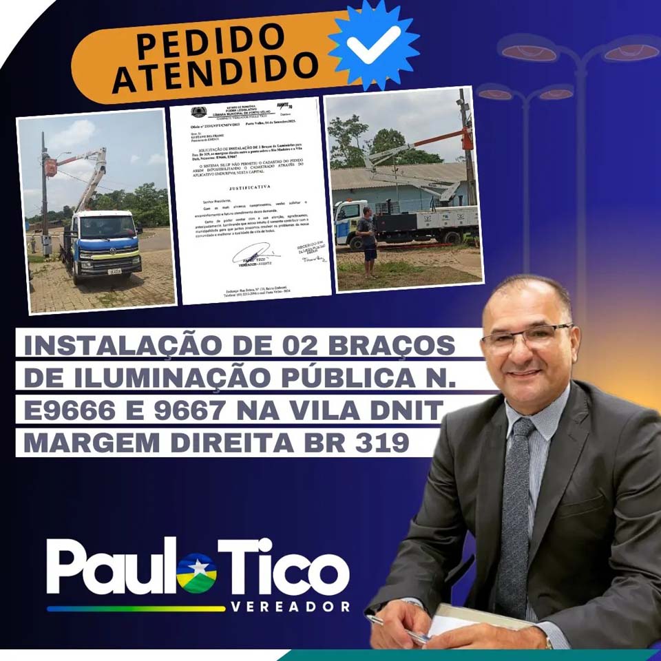 Porto Velho;RO - O vereador Paulo Tico teve mais pedido de providência atendido pela prefeitura de Porto Velho. Desta vez a solicitação foi atendinda pelas equipes da EMDUR, que realizaram serviços de Implantação de dois braços de Iluminação pública, próximo aos números E9666 e 9667, na Vila Dnit, margem direita da BR 319.