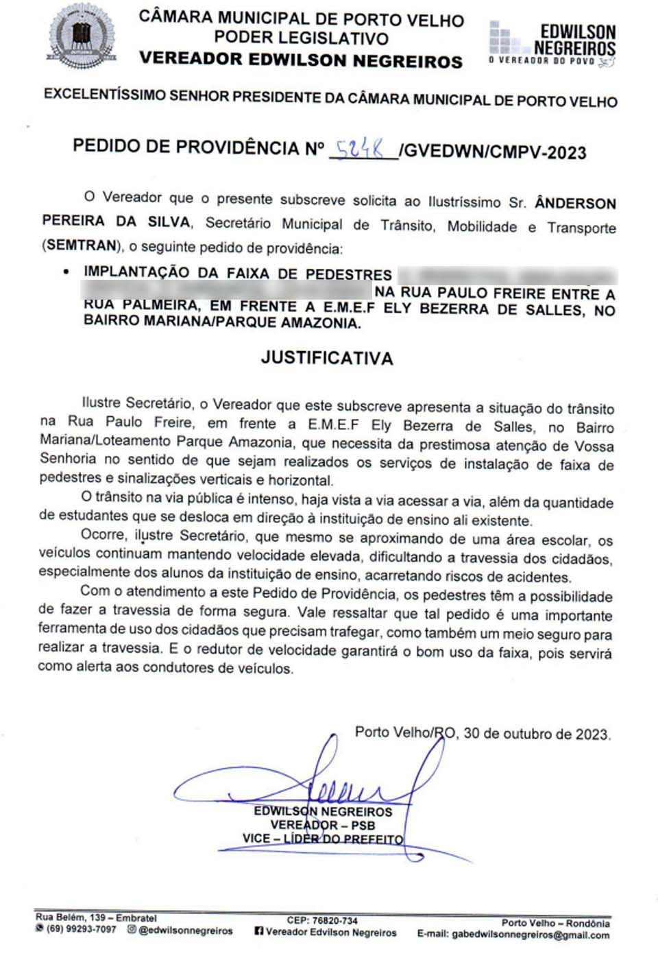Porto Velho, RO – O vereador Edwilson Negreiros, do PSB, encaminhou Pedido de Providência à Secretaria Municipal de Trânsito (SEMTRAN), hoje comandada Anderson Pereira da Silva.