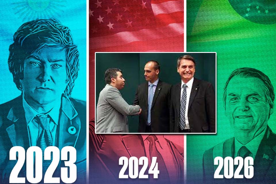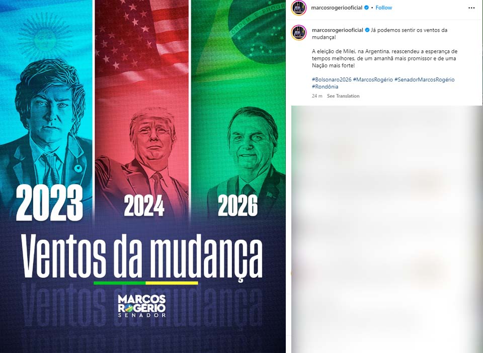 O membro do Senado Federal ilustrou seu posicionamento com uma arte que mostra Milei no Poder em 2023, algo já concretizado; Donald Trump, em 2024, nos Estados Unidos da América; e Jair Bolsonaro, no Brasil, em 2026, ignorando que, à ocasião da data, a pena de inelegibilidade aplicada ao antigo morador do Palácio da Alvorada ainda estará em vigor.