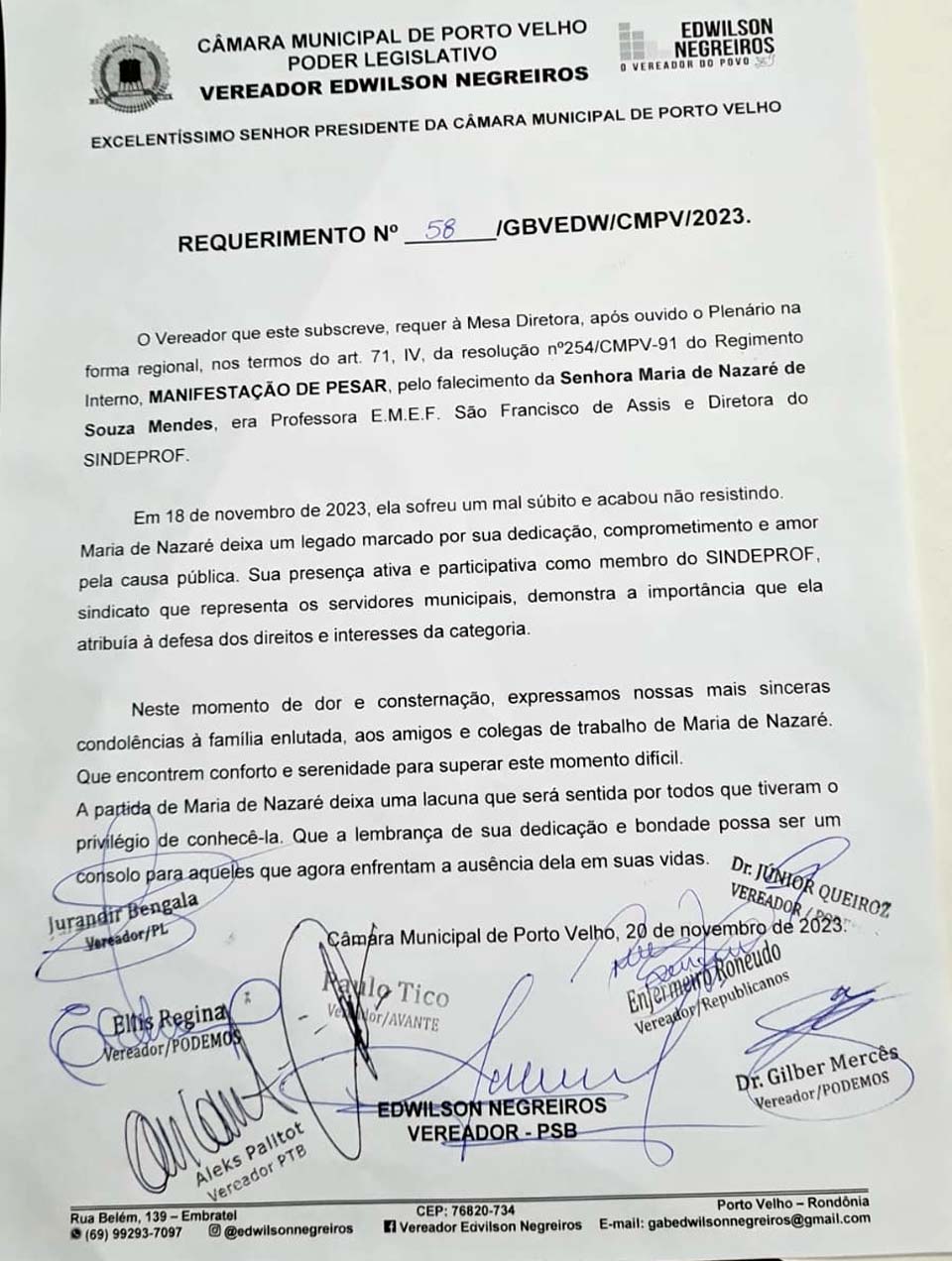 Porto Velho, RO – A pedido do vereador Edwilson Negreiros, do PSB, membro da Câmara Municipal de Porto Velho, outros edis assinaram Manifestação de Pesar oficial em memória da servidora pública da Prefeitura de Porto Velho Maria de Nazaré de Souza Mendes. Lotada no Município, Maria de Nazaré destacou-se como professora, com legado ainda mais pujante na Direção da Escola Municipal de Ensino Fundamental (EMEF) São Francisco de Assis, educandário situado no Bairro Ulisses Guimarães.