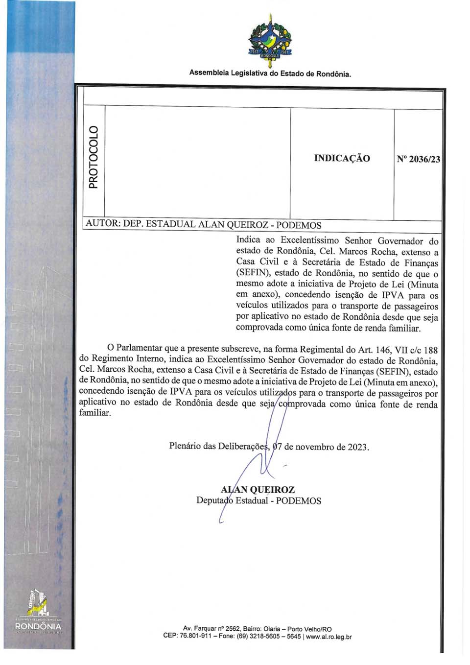 Com a finalidade de propor a isenção do Imposto sobre a Propriedade de Veículos Automotores (IPVA) para os automóveis empregados no transporte de passageiros por aplicativos, os quais representam a única fonte de renda familiar, o deputado estadual Alan Queiroz (Podemos) sugeriu ao Governo de Rondônia, por meio da Secretaria de Estado de Finanças (Sefin), a adoção da proposta mediante um Projeto de Lei.