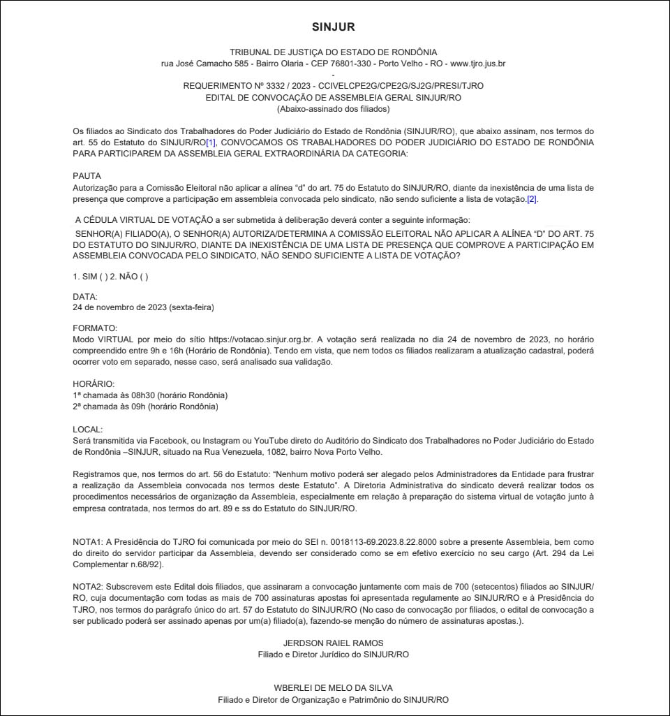 Edital de Convocação de Assembleia Geral - SINJUR/RO