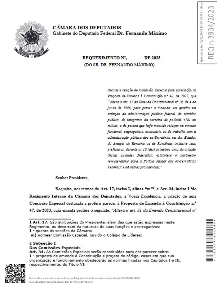 Requer a criação de Comissão Especial para apreciação da Proposta de Emenda à Constituição n.º 47, de 2023, que “Altera o art. 31 da Emenda Constitucional nº 19, de 4 de junho de 998, para prever a inclusão, em quadro em extinção da administração pública federal, de servidor público, de integrante da carreira de policial, civil ou militar, e de pessoa que haja mantido elação ou vínculo funcional, empregatício, estatutário ou de trabalho com a administração pública dos ex-Territórios ou dos Estados do Amapá, de Roraima ou de Rondônia, inclusive suas refeituras, durante os 10 (dez) primeiros anos da criação dessas unidades federadas; estabelece o parâmetro remuneratório para a Polícia Militar dos ex-Territórios Federais; e dá outras providências.”