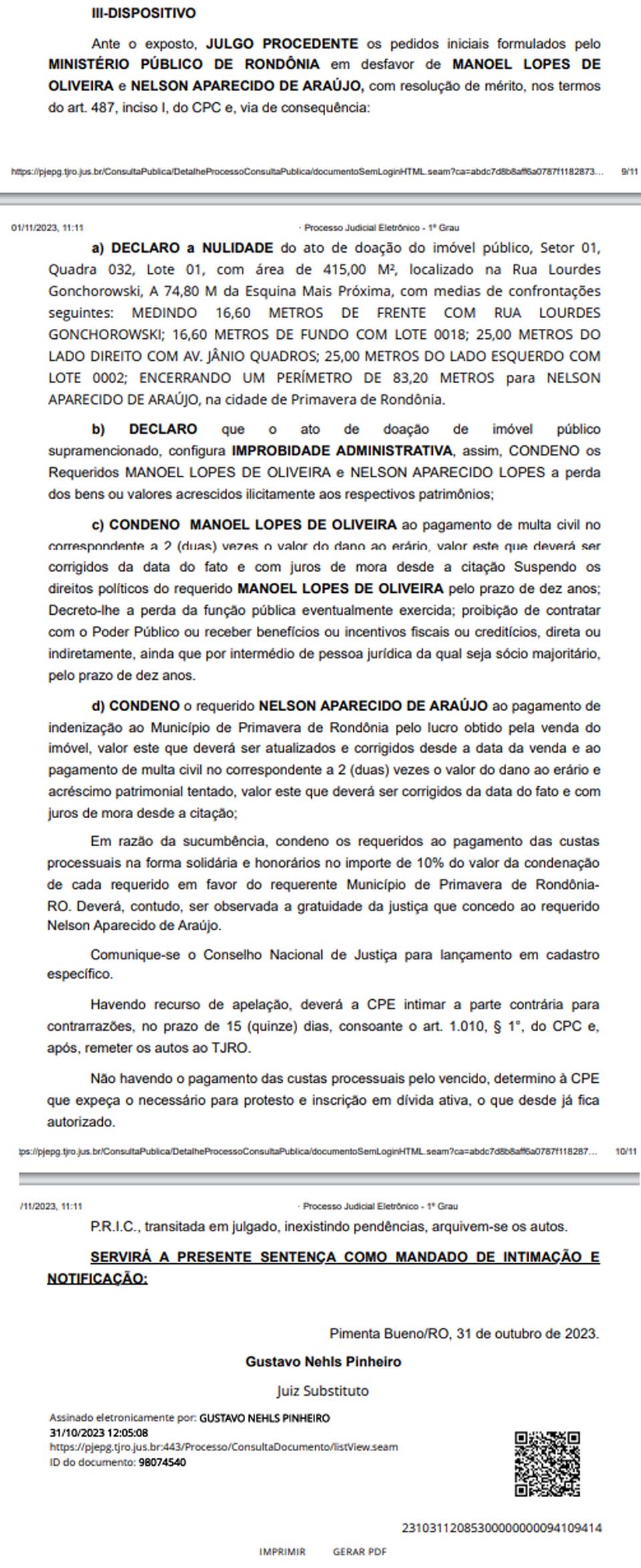 A decisão também ressaltou que o ato de doação configurou improbidade administrativa e determinou a perda dos bens ou valores acrescidos ilicitamente aos respectivos patrimônios dos réus. Manoel Lopes de Oliveira foi condenado a pagar multa civil correspondente a duas vezes o valor do dano ao erário. Nelson Aparecido foi condenado ao pagamento de indenização ao Município de Primavera de Rondônia pelo lucro obtido pela venda do imóvel, "valor este que deverá ser atualizados e corrigidos desde a data da venda e ao pagamento de multa civil no correspondente a 2 (duas) vezes o valor do dano ao erário e acréscimo patrimonial tentado, valor este que deverá ser corrigidos da data do fato e com juros de mora desde a citação", anotou o juiz Gustavo Nehls Pinheiro.