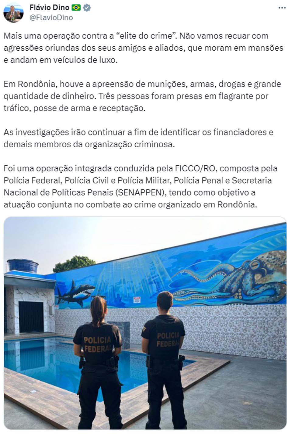 Porto Velho, RO – Em mais uma ação de combate à criminalidade, uma operação contra a "elite do crime" foi conduzida em Rondônia. O ministro da Justiça e Segurança Pública do governo Lula, Flávio Dino, destacou a ofensiva em sua conta no Twitter, ressaltando o compromisso em não recuar diante de possíveis reações advindas de indivíduos associados à criminalidade.