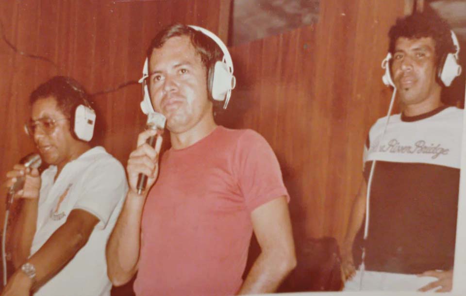 (F. Miguel Silva e Walter Santos comentando da cabine da G-35 no Aluizão e Zé Ribamar (c) narrando – foto acervo pessoal Zé Ribamar)