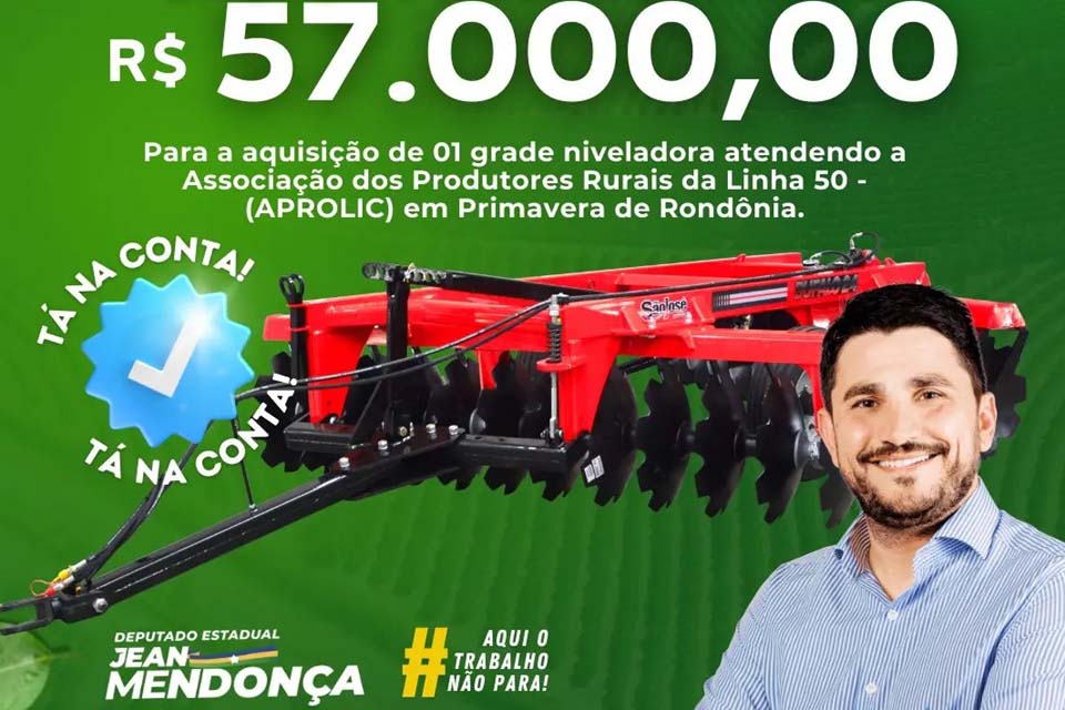 O Produtores Rurais recebem recebe recurso destinado por Jean Mendonça para a compra de uma grade niveladora . "Essa é uma conquista importante para a APROLIC e para todos os que vivem do campo em Primavera de Rondônia", comemorou o deputado.