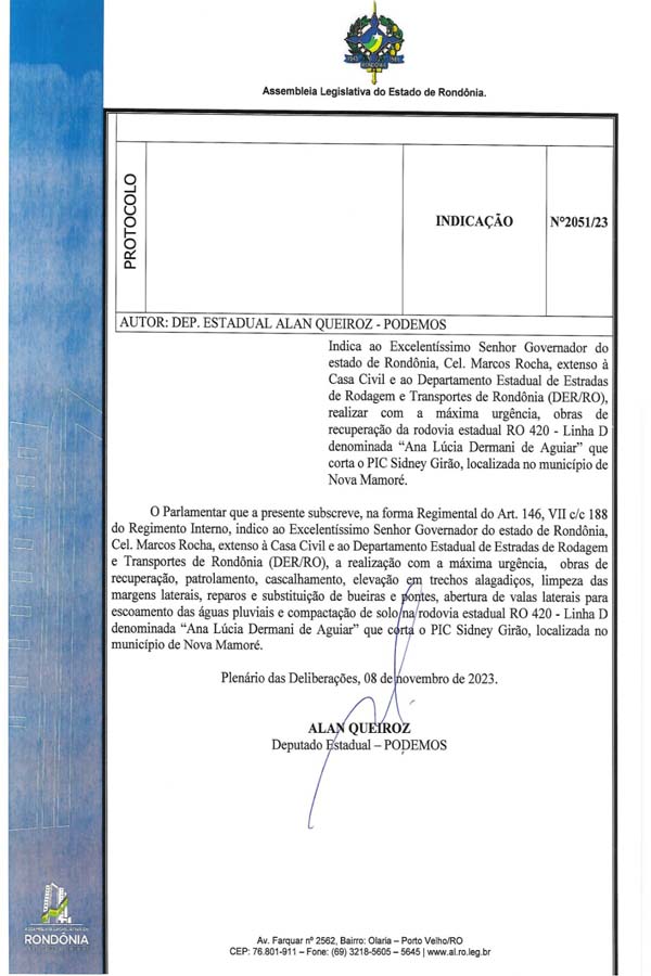 Sendo assim, o deputado Alan Queiroz propôs ao Governo de Rondônia, por meio do Departamento Estadual de Estradas de Rodagem e Transportes, a execução de obras na rodovia estadual RO-420. As intervenções incluem recuperação, patrolamento, cascalhamento, elevação em áreas alagadiças, limpeza das margens laterais, além de reparos e substituição de solo.