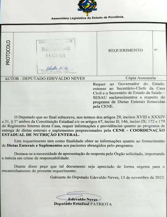 O Deputado Edevaldo Neves (Patriota) solicitou esclarecimentos ao Governador, à Casa Civil e à Secretaria de Estado da Saúde sobre o programa de Dietas Enterais fornecidas pela CENE.
