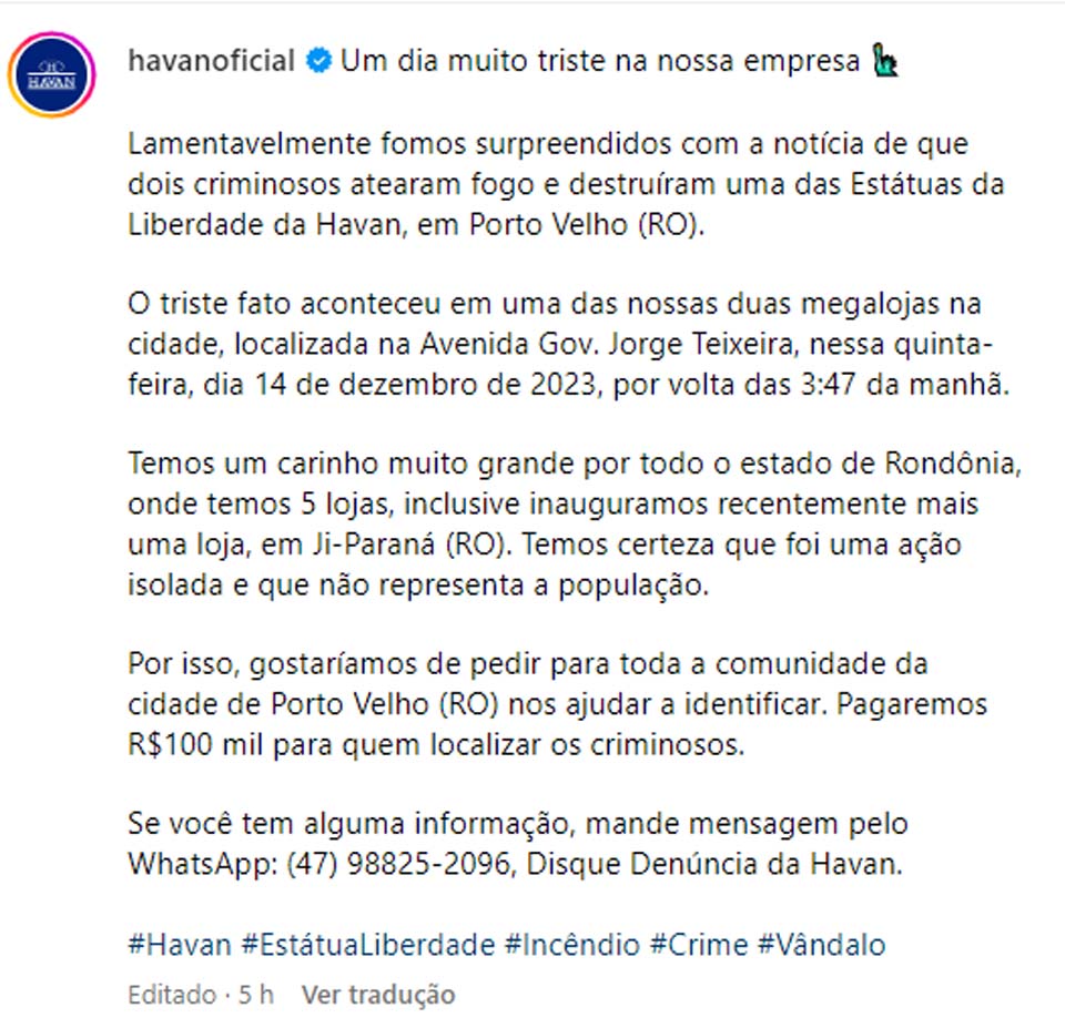 Diante do ocorrido, a Havan está mobilizando a população de Porto Velho para colaborar na identificação dos responsáveis. Como incentivo, a empresa está oferecendo uma recompensa no valor de R$100 mil para qualquer pessoa que forneça informações que levem à captura dos criminosos.