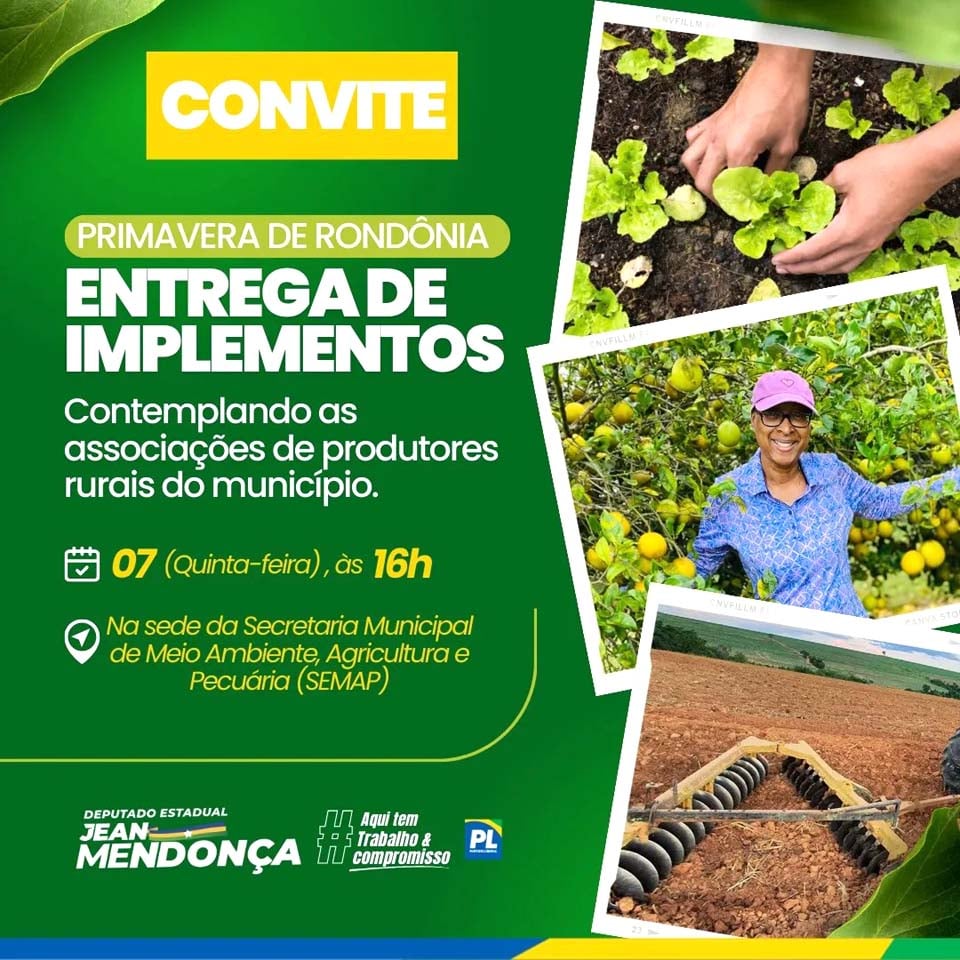 Porto Velho;RO – O Deputado Jean Mendonça anunciou nesta quarta-feira (6), a cerimônia de entrega de implementos agrícolas que beneficiarão as associações de produtores rurais do município de Primavera de Rondônia.