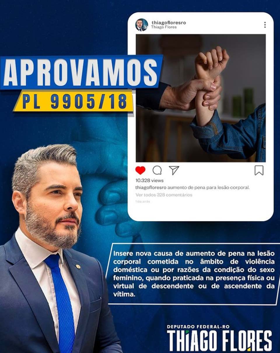 Por meio de sua conta oficial no Instagram, o parlamentar compartilhou a notícia com seus seguidores, destacando a importância das penas mais severas para crimes de lesão corporal. Em sua publicação, Thiago Flores expressou sua preocupação diante do crescente número de casos de violência, sobretudo contra mulheres e crianças, no âmbito familiar.